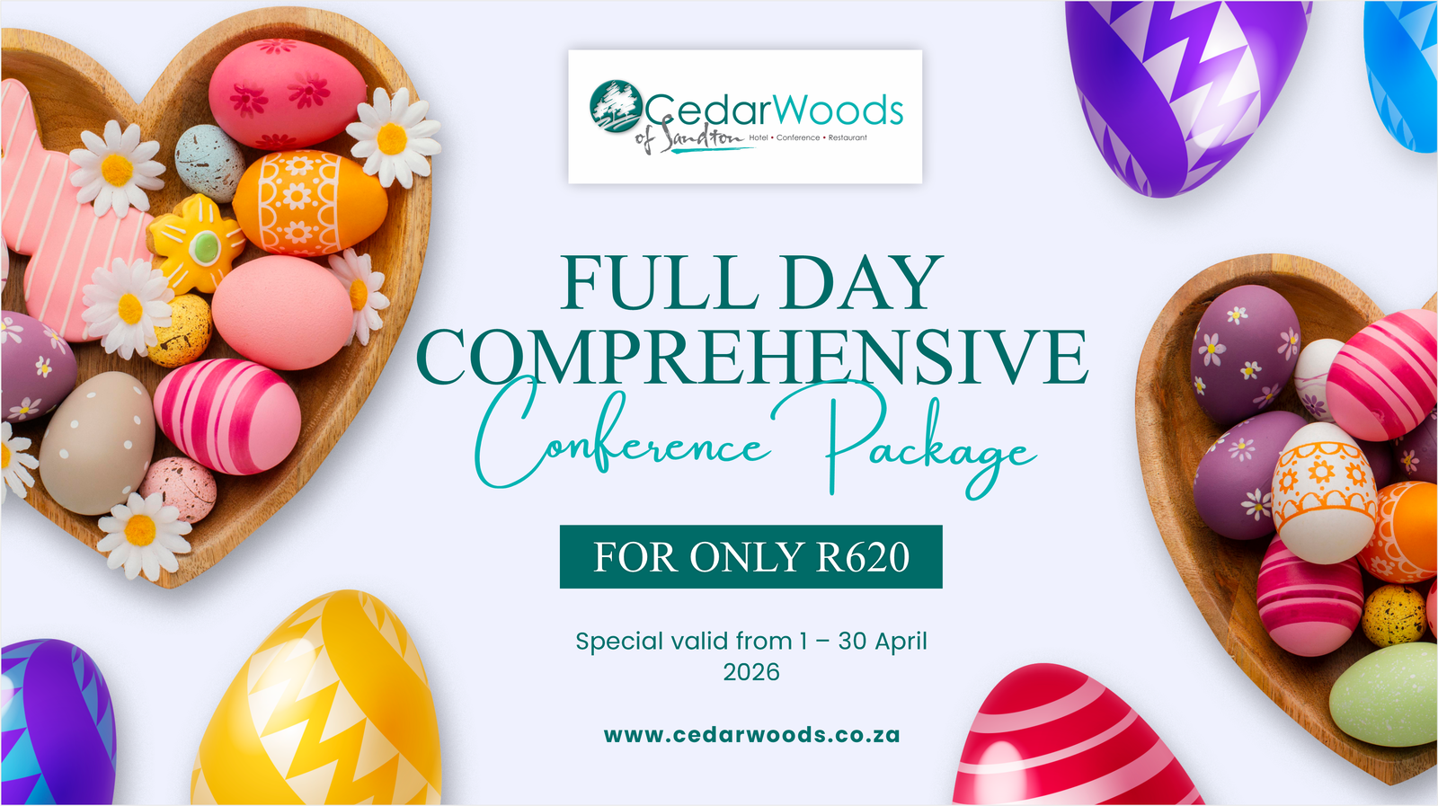 Share This OfferCelebrate this Easter season with inspiration for your next business event. Cedarwoods of Sandton is still offering our popular Full Day Conference Package for R620 per person, perfect for meetings, workshops, and team-building sessions.